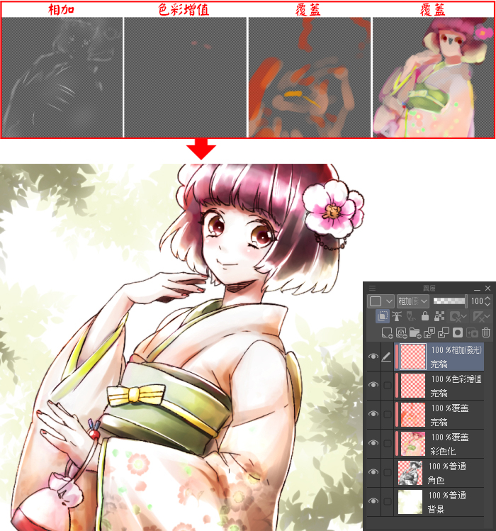 「相加(發光)」→能配合下方塗抹的顏色來提高亮度的圖層模式。可以用在想加上亮部等重點部分的時候。