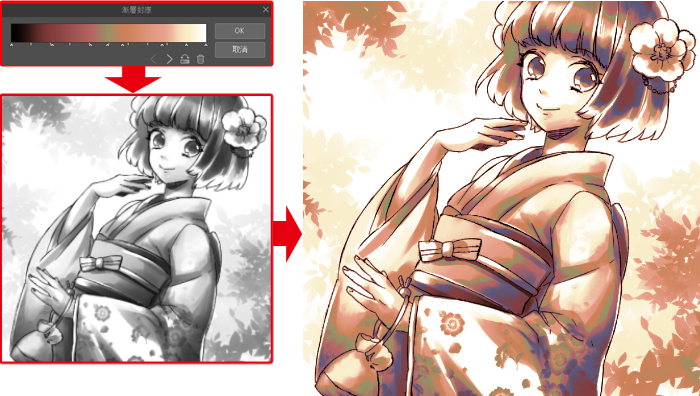 如果使用支援「漸層對應」功能的繪圖軟體,可以輕鬆把以灰色塗抹的圖像變成效果讓人印象深刻的插圖。