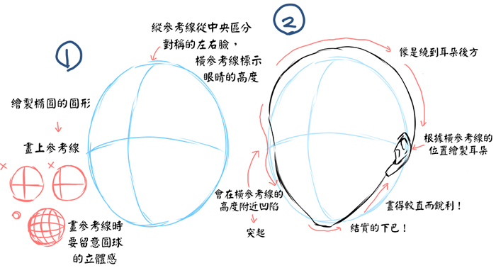 這邊的參考線並非直線,而是要繪製成符合圓形弧度的線條,它可以幫助大家在繪製時留意頭部的立體感。