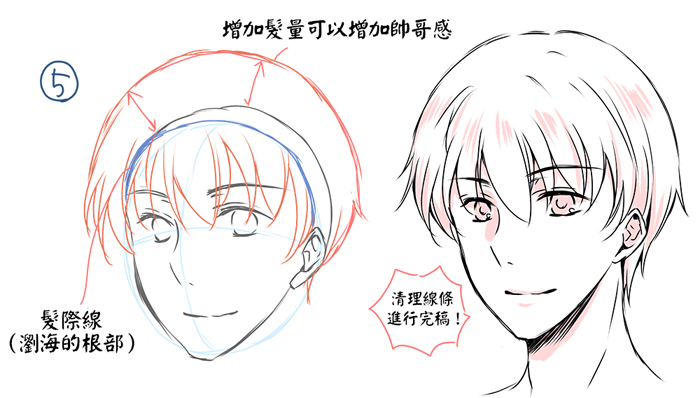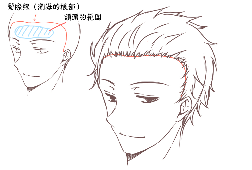 最後要繪製的是頭髮,因為男性的短髮角色特別多,所以有時可能也會畫到梳起瀏海的髮型。