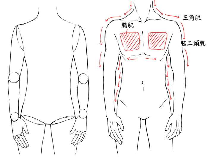 在習慣之前,可以和繪製脖子・肩膀時相同,先繪製缺乏弧度的身形,然後再加上肌肉。