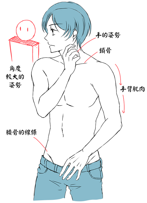 和女性不同,要繪製成長有肌肉的身體。如果凹凸起伏太少,看來就會像是少年的體型。