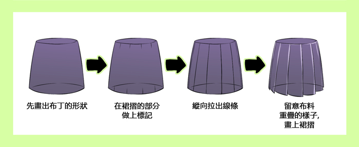 有荷葉邊和裙摺的裙子就算不另外畫上皺褶也沒關係,但像窄裙等比較樸素的裙子,稍微加上一點皺褶看來會比較有真實感。