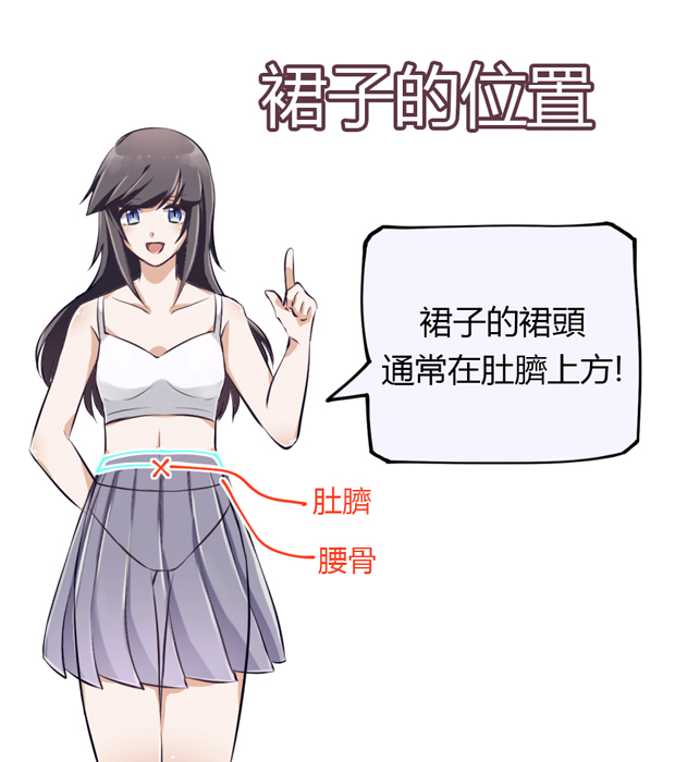 穿上裙子後的位置實際上會在肚臍上方,但插圖或漫畫等常會把裙子畫在能露出肚臍的高度。