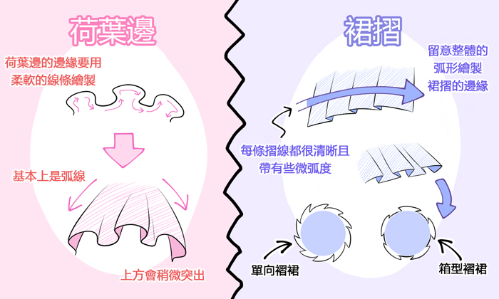 跟荷葉邊和裙摺的柔軟感相反,這邊的訣竅在於用銳利的線條繪製。