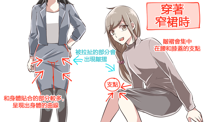 窄裙的布料在胯下部分通常會比較鬆一些,它的特徵在於被向左右拉扯時容易出現皺褶。