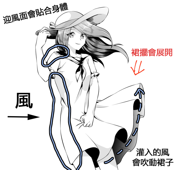 繪製被風吹動的裙子時,迎風部分的衣服會貼緊身體,沒有貼合身體的部分會隨風搖擺。