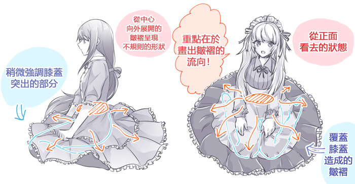 不管是鼓起還是攤平的部分都要用柔軟的線條畫出布料的流向,讓裙子呈現自然展開的樣子。