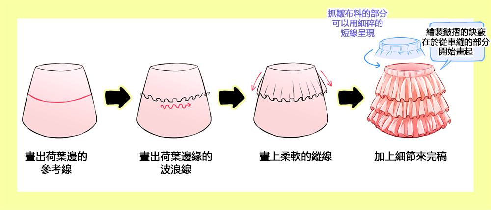 先仔細想好荷葉邊的皺褶會出現在哪個位置,畫上參考線後,再用柔軟的線條繪製。