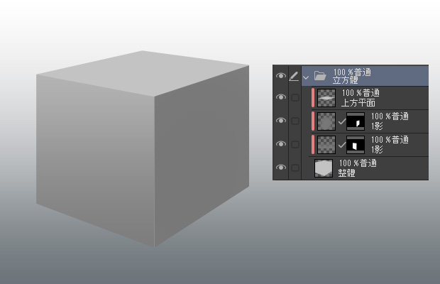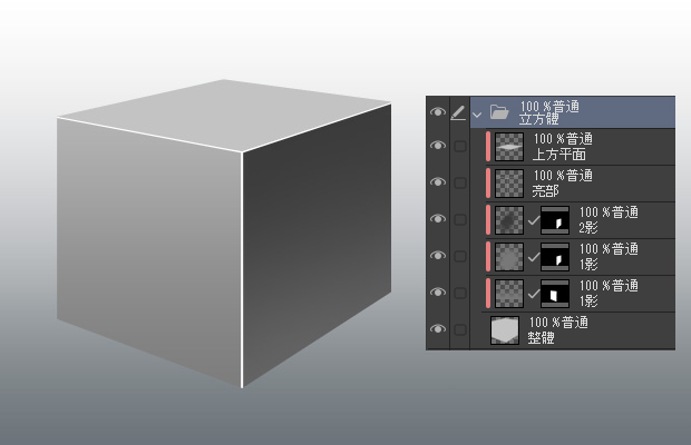 把側邊的面和上方的面區分到不同的圖層裡,這樣在之後的步驟中塗抹不同平面的陰影和亮部時會比較輕鬆。