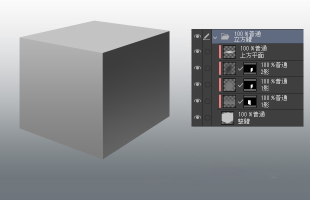 只幫右側的面建立「2影」圖層,塗上較濃的陰影色。