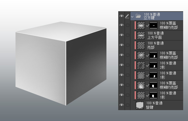 這樣就大致完成了,但像立方體這種平面面積較大的金屬,如果只畫到這個步驟,看來可能會有點像是塑膠材質,讓人感覺不大對勁。