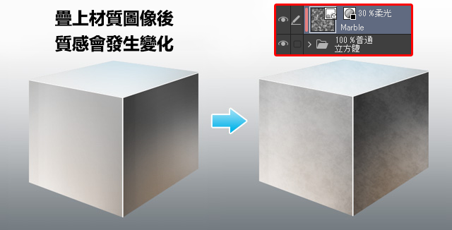 把材質的混合模式變更為「柔光」,並調降不透明度。