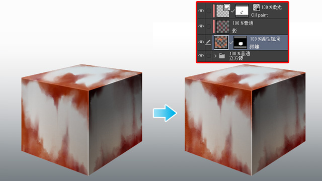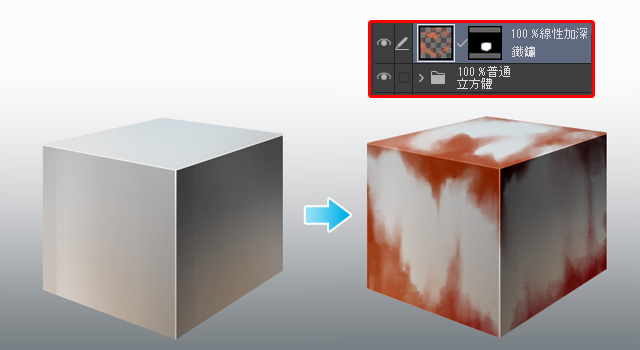 在「鐵鏽」圖層上繪製鐵鏽。為了配合立方體整體的陰影,這邊把鐵鏽圖層的混合模式設定為「線性加深」。