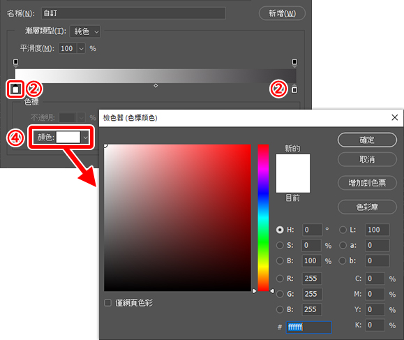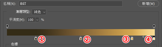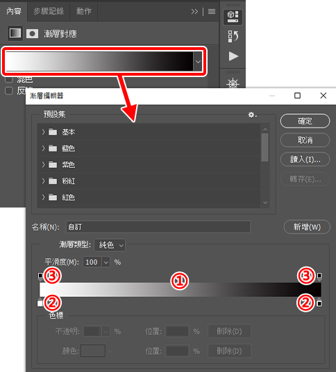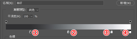 「漸層編輯器」的①部分是已經設定的漸層顏色。