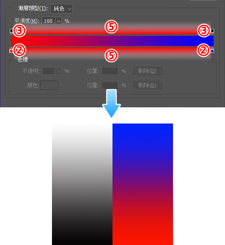 ②的色標部分可以用來變更漸層的顏色,形狀相似的③則能調整顏色的不透明度。