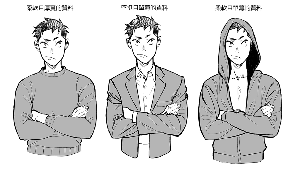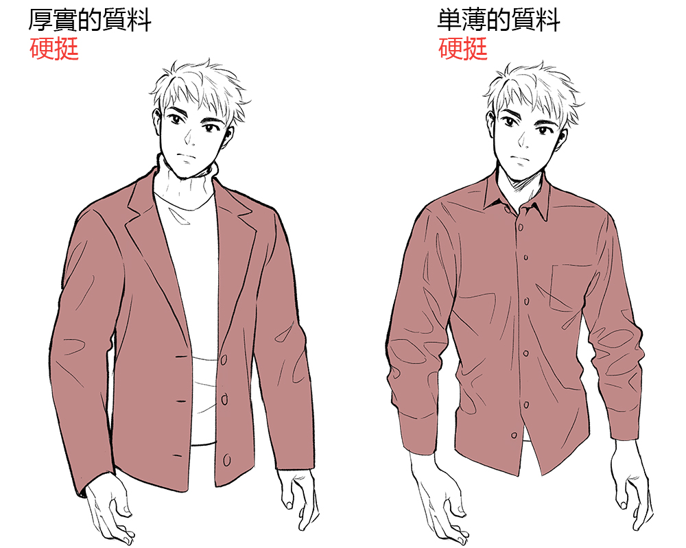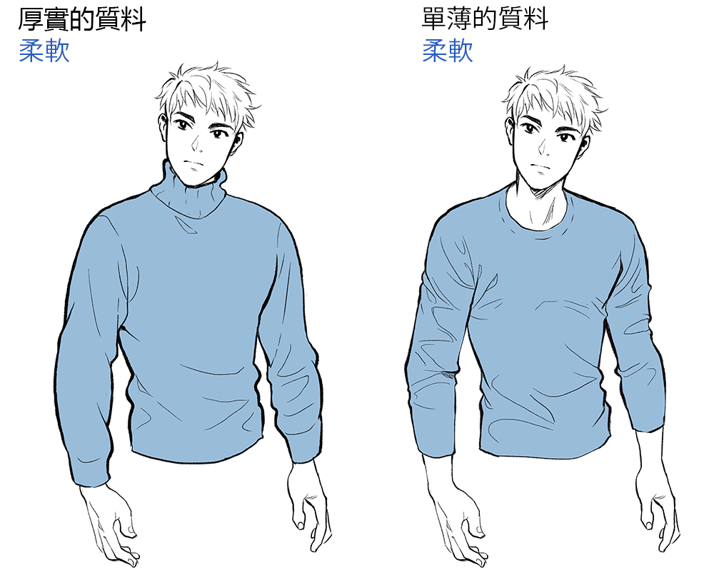 皺褶的多寡取決於布料重量和素材種類,在繪製布料時,建議首先考慮質料的「厚/薄」、「硬/軟」、「重/輕」、「平滑/粗糙」。