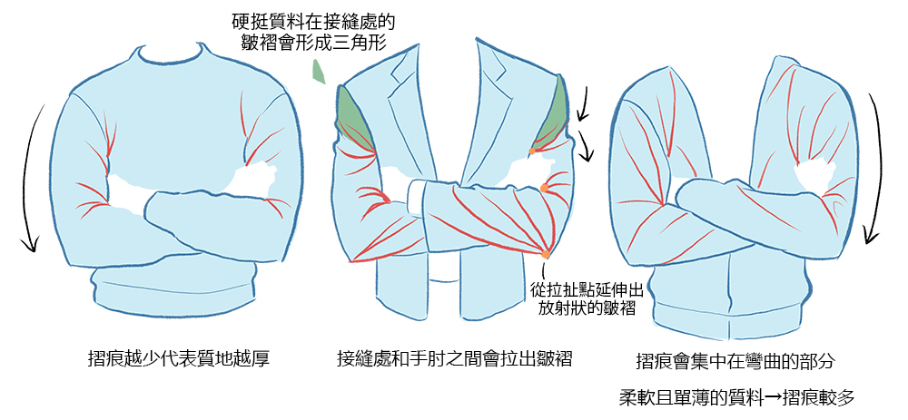 皺褶的形狀會隨著手臂的動作發生大幅度的變化。
