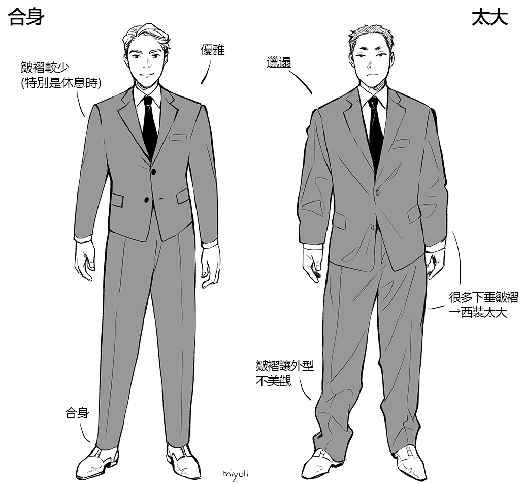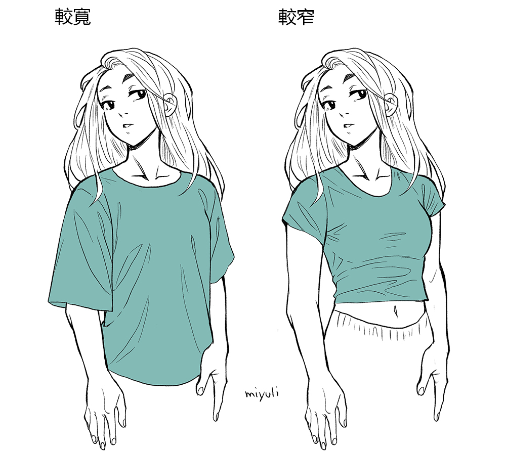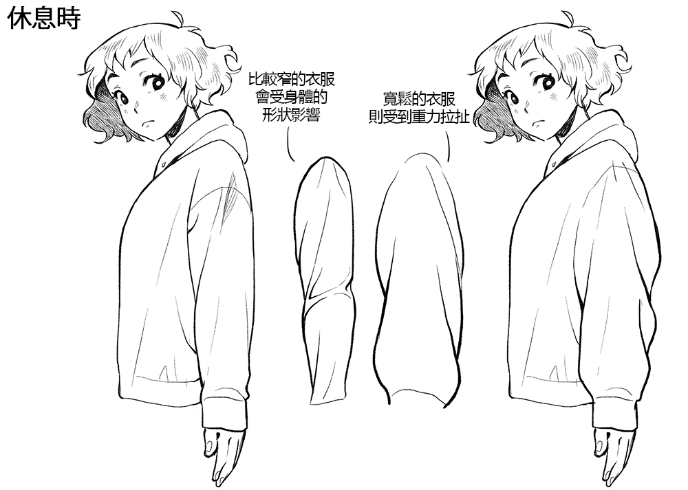 寬鬆衣服和貼身衣服產生的皺褶也不一樣。貼身衣服的皺褶會沿著身體曲線發生變化,而寬鬆的衣服上較常出現從拉扯點朝地面下垂的皺褶。