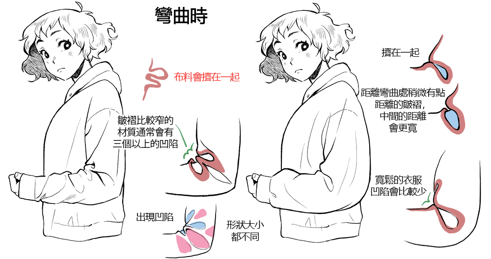 做出彎曲身體的動作時,布料會受到擠壓,形成幾處大小不同的凹陷。