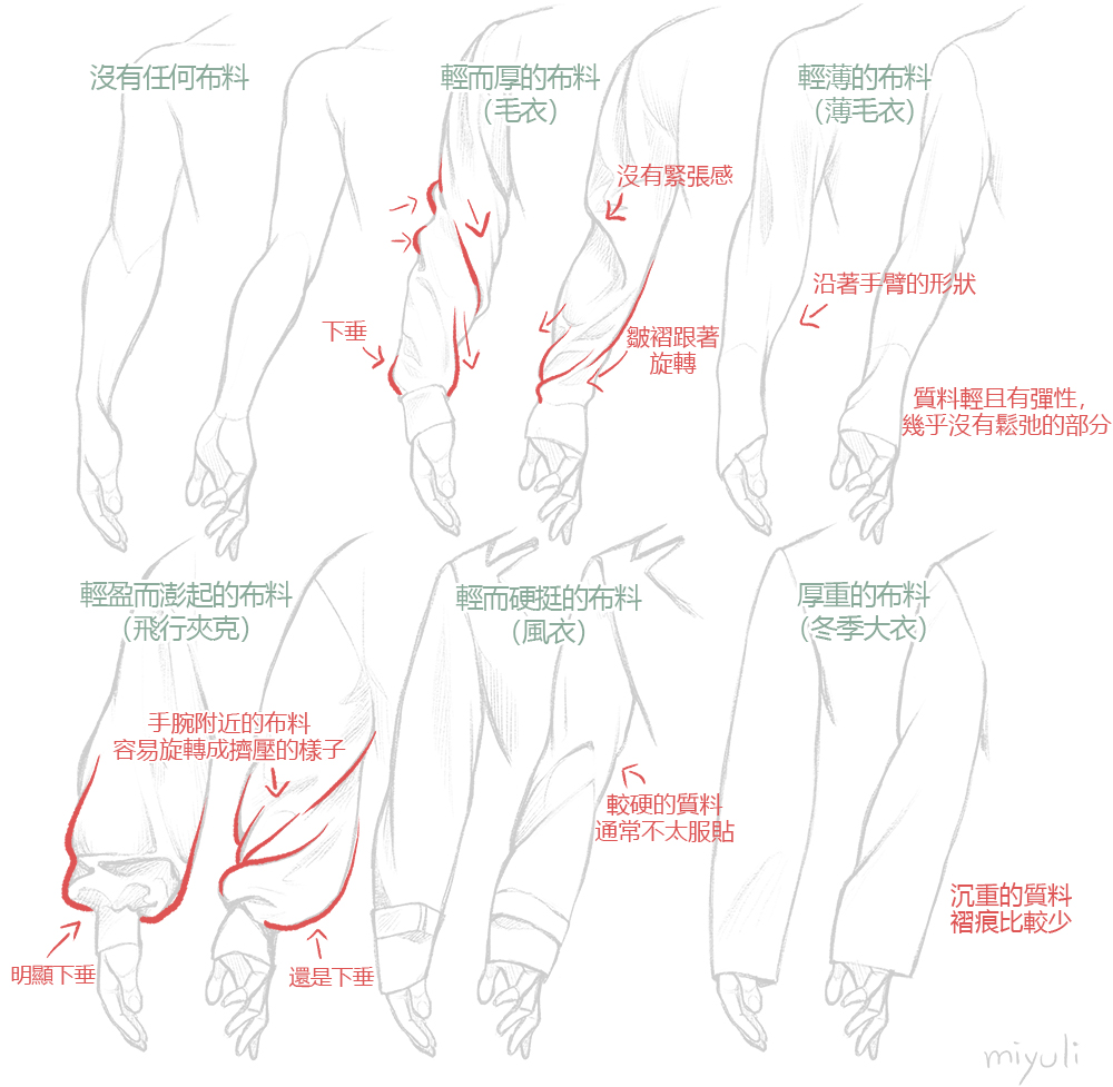 在繪製皺褶的時候,考慮布料的材質是一件非常重要的事情。每種質料都有它的特性,認識布料的材質有助於我們繪製出適當的摺痕位置,並想像皺褶產生的陰影會線什麼樣子。