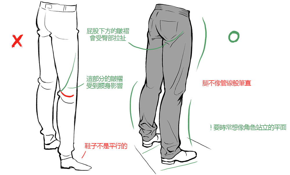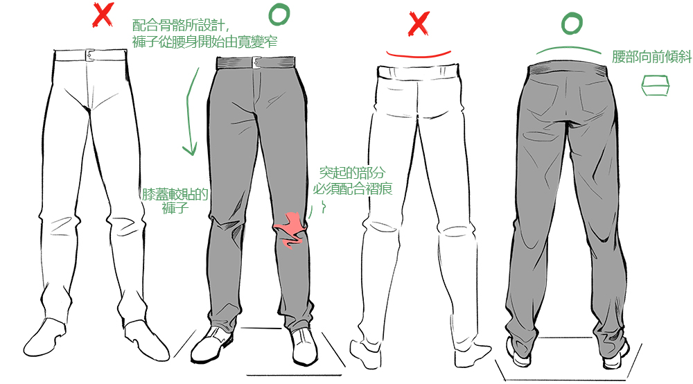 抬起腿時,膝蓋會成為最強的拉扯點。請注意在移動腿的時候,褲子的布料會呈現什麼樣的形狀。
