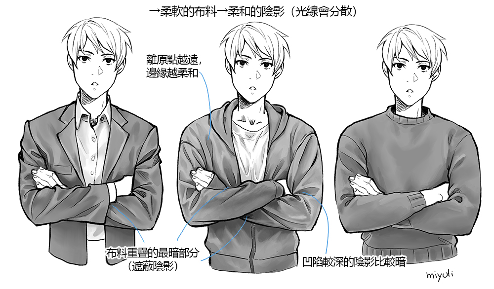 依質料不同,陰影(例如摺痕之間的寬度)在柔軟陰影和亮部之間會發生變化,如果想追求更高的作品完成度,建議多多接觸各種材質並加以研究,豐富自己的知識。
