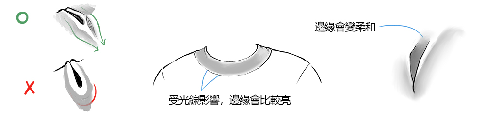 幫陰影上色時,請記得注意質料的光滑度和柔軟度。質料越光滑越容易反射光線,亮部就會顯得更亮,反之,質地粗糙的話,光線看起來就會比較模糊。