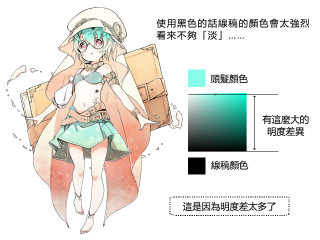 為什麼要用這種顏色來繪製線稿呢?因為「線稿」是「角色整體上最濃的顏色」,所以需要讓這個「角色整體上最濃的顏色」貼近「淡色的顏色範圍」。