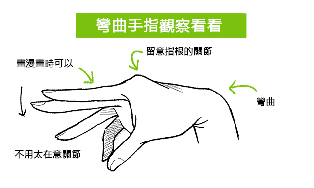 請併攏你的食指到小指,把這四根手指同時向前彎曲,彎曲的部分正是3的範圍,反過來說,沒有動作的區塊就屬於1的部分。在上面繪製第三個關節(手指根部的關節),之後再開始描繪手指頭,這樣就能畫出看來協調的手部。