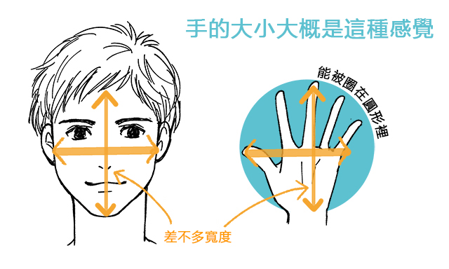 拇指到小指的距離寬度和臉部寬度大致相同。在大部分的狀況下,完全展開的手掌可以被包含在一個圓形裡。在分格裡大大地畫出手部時,可以把外緣想像成正圓形來繪製。
