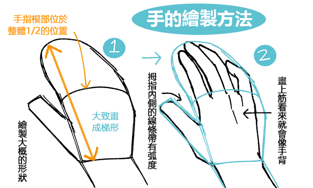 手可以分解成三個部分,分別是「1.手背」、「2.拇指」、「3.拇指以外的四根手指」。