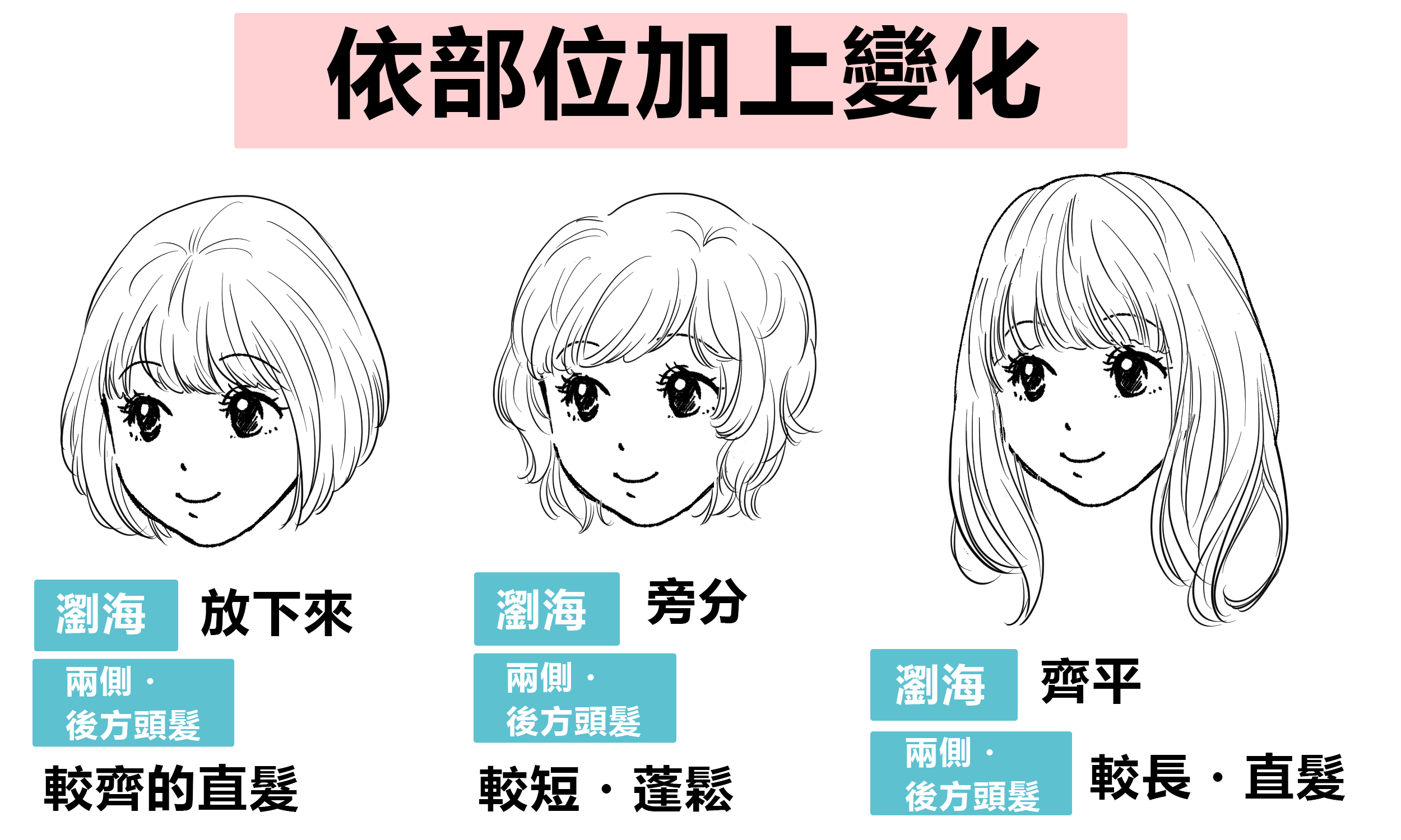 舉例來說,幫這三個部分分別加上下述的變化,就能繪製出各種角色的頭髮。