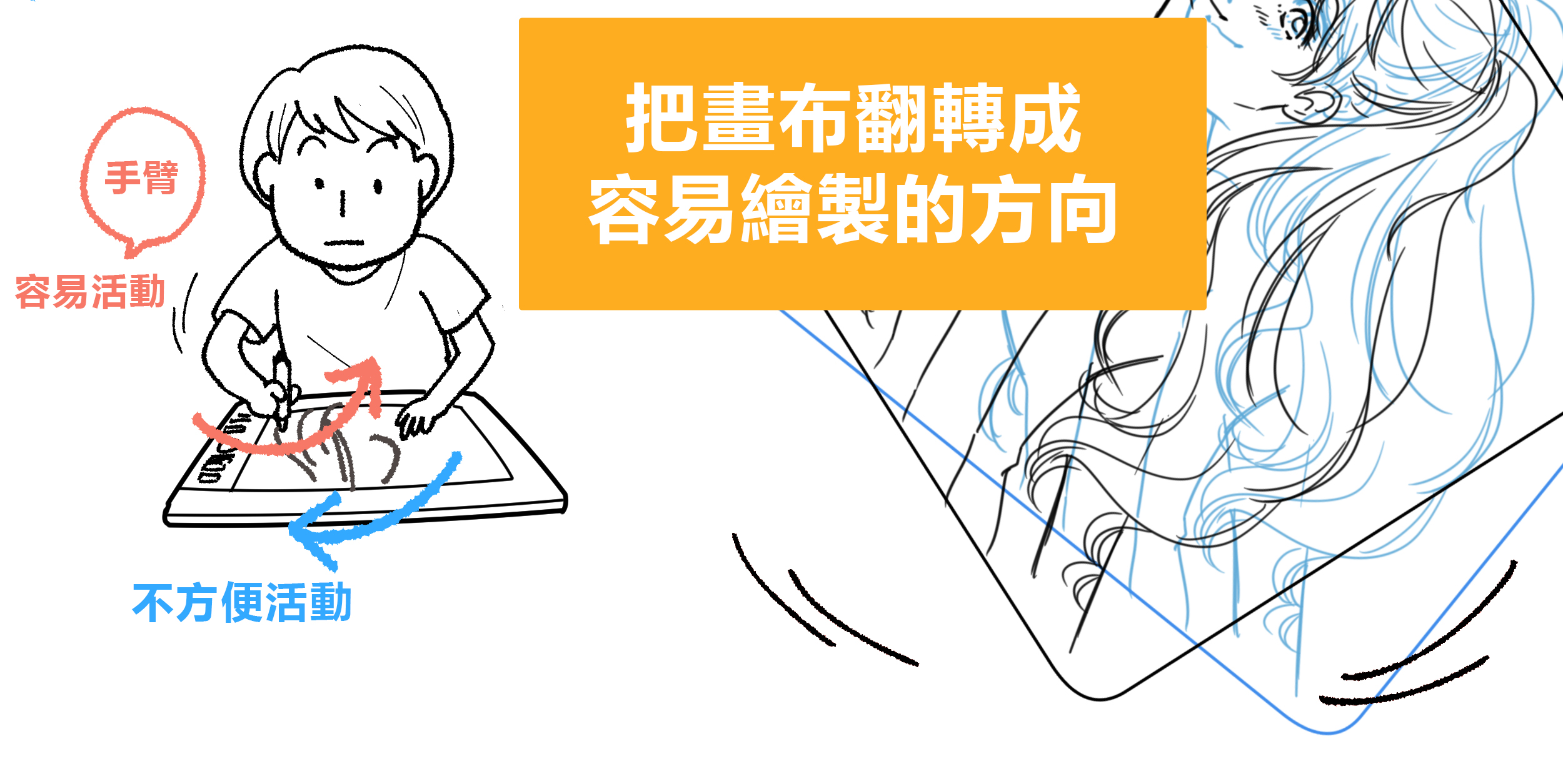 頭髮部分的線條特別容易偏移底稿。不需要勉強自己往不容易畫的方向動筆,多多把紙張和畫布旋轉成自己繪製起來順手的方向吧。