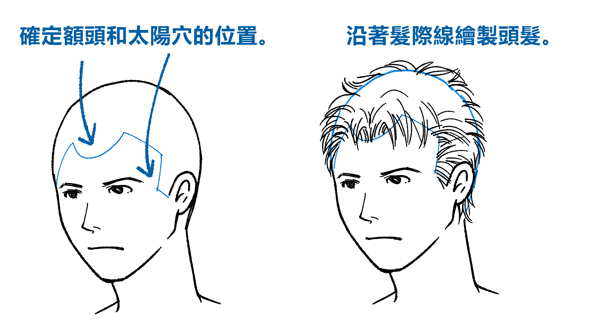 在繪製男性頭髮的時候,只要留意髮際,看來就會更像一回事。