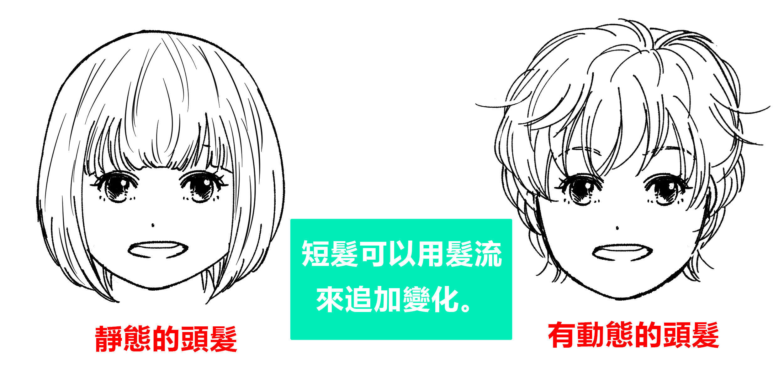 因為不容易受到重力影響,讓頭髮的一部份翹起來或是幫髮束加上一些變化,髮型就會看來比較自然。如果沿著輪廓線清楚地畫上去,會呈現看來像是頭盔一樣的髮型,當然有些時候也可以刻意繪製這樣的角色。
