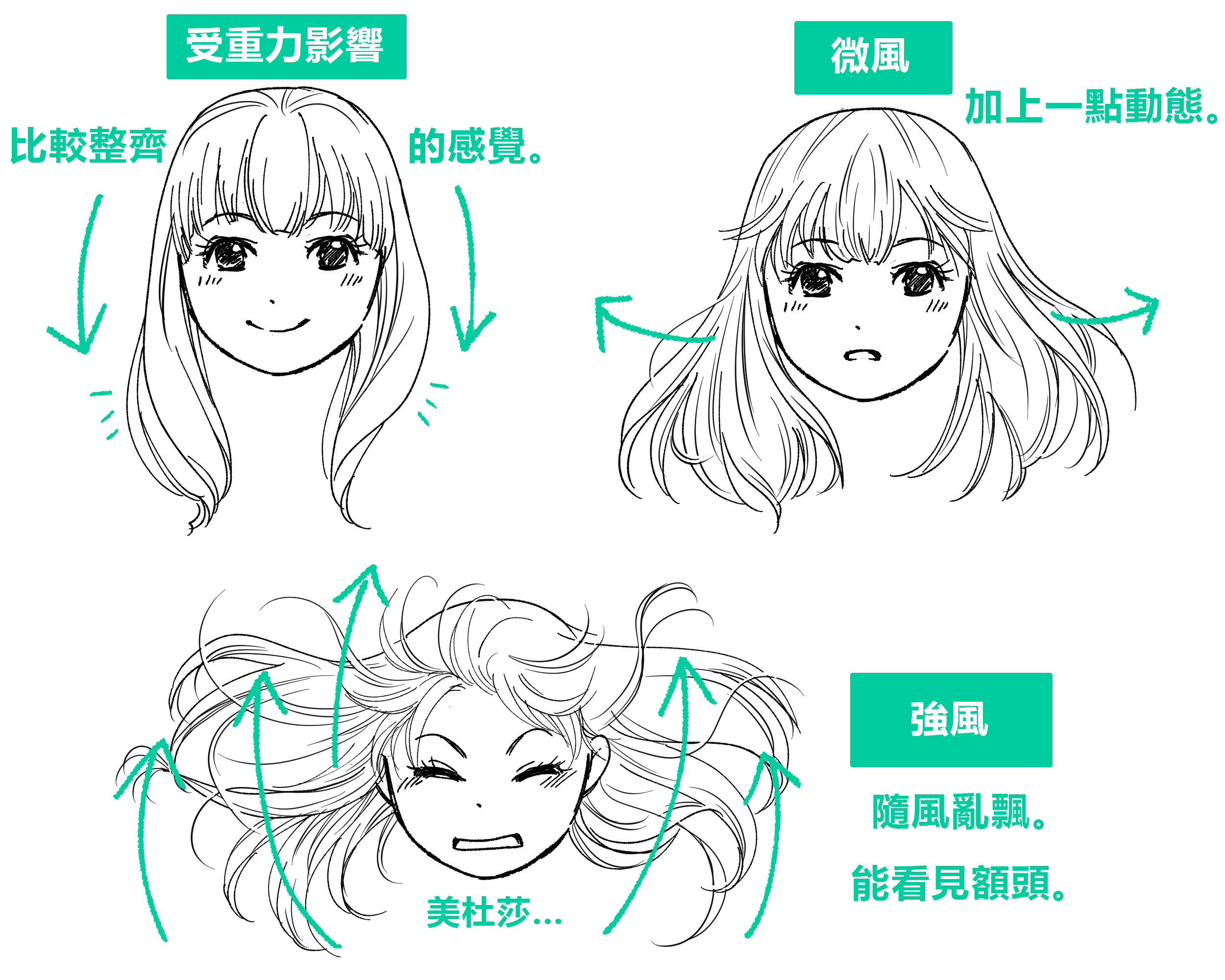 繪製長而重的長髮時,可以想像成髮絲末端掛有秤錘而向下落去的感覺。