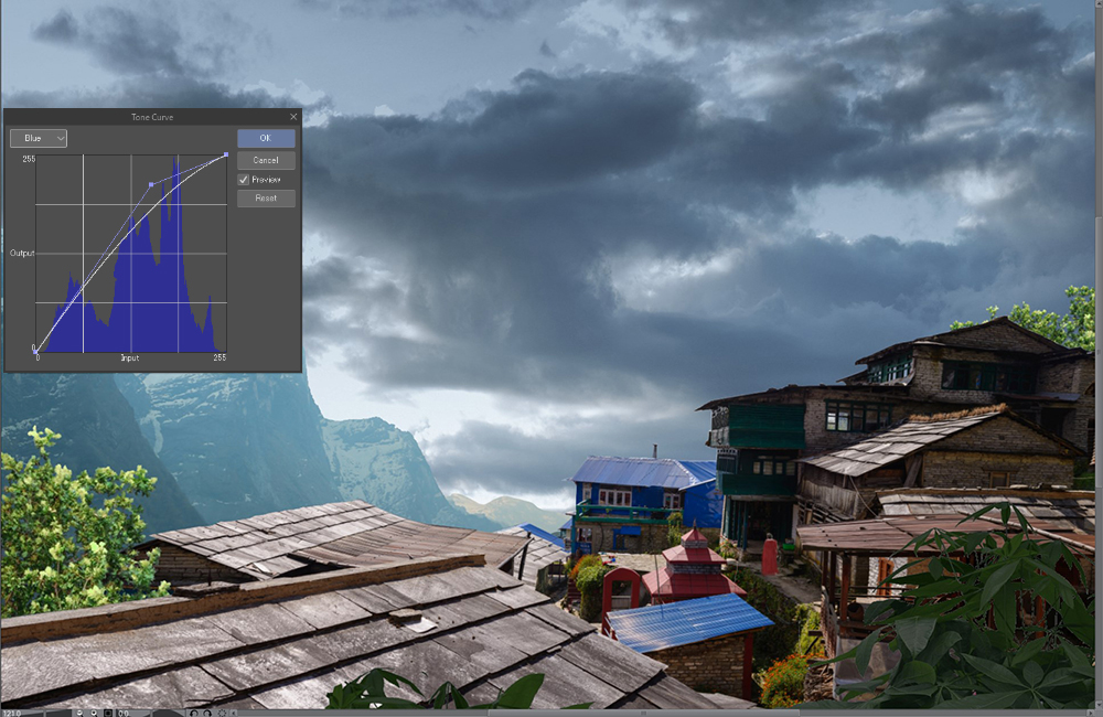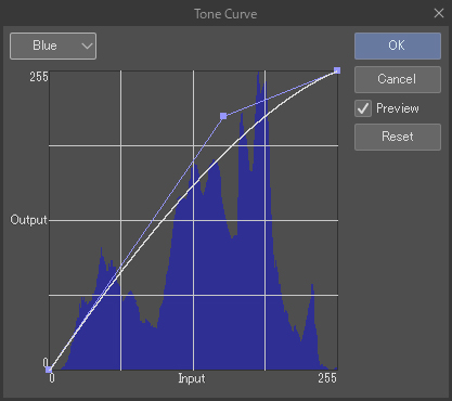 接著在[色調曲線]中變更RGB通道,讓整體看來呈現藍色。