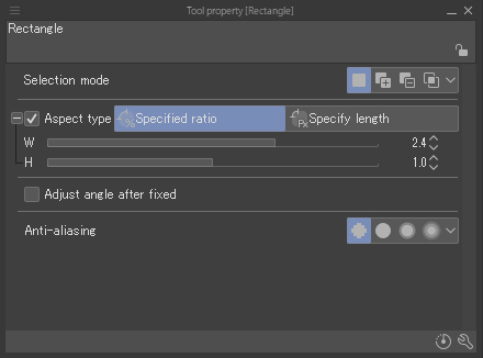 以[長方形選擇]輔助工具建立選擇範圍,勾選選項中的[指定長寬],並選擇[指定比例](左側的圖示)。將橫設為2.4,縱則保持初始設定。