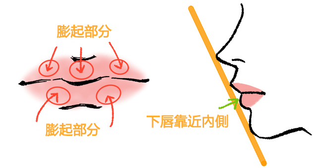 嘴唇會順著牙齒的弧度呈現曲線型,越靠近中間的部分厚度越厚。上唇會稍微覆蓋住下唇,因此下唇的寬度會比上唇來得窄,稍微藏在內側,所以嘴角部分就形成了陰影。上唇膨起的位置有三處,分別是中間+左右兩側。下唇則只有左右兩側,而中心稍微有點凹陷。