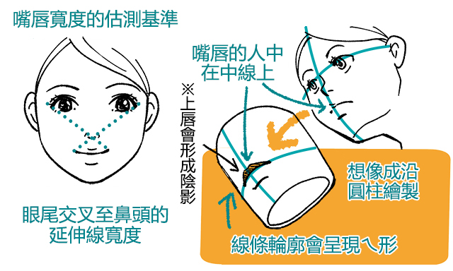 先決定好嘴唇寬度,接著再考慮下唇中央與上唇的唇峰部分,最後將它們用線連接條起來,就會形成嘴唇的形狀。只要學會這種以十字形中線為基準敲定「嘴唇寬度・下唇中央・人中」的畫法,就算臉部角度發生變化,畫出來的嘴巴位置應該也不會太過奇怪。