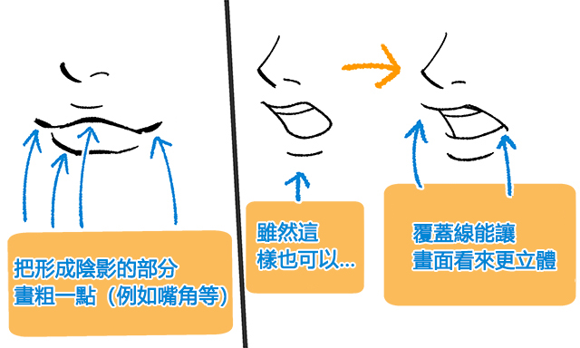 再來,只要記住「把上方覆蓋部分的線畫長一點」這種「覆蓋線」的畫法,就算線條不多也能畫出有立體感的插畫。這種手法通常可以用在繪製閉口時重疊的上下唇,以及開口時的嘴唇與口中。