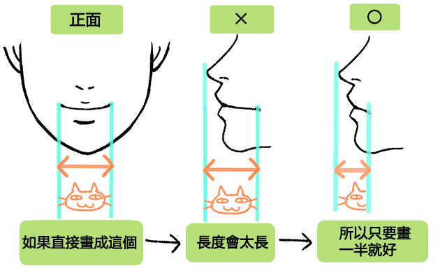側面的嘴唇寬度是從正面看長度的一半。上唇的突起部分不會超出鼻尖,而下唇的位置會比上唇稍微內凹一點。從側面觀看時,上唇的唇尖會稍微朝上,呈現「鴨子嘴」的樣子。若從下方角度仰視臉部的話,嘴唇的位置會比較靠近鼻子。