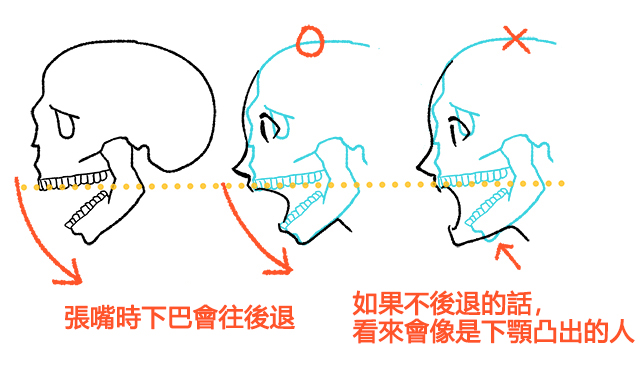 想像一下骨骼,應該就能理解在張大嘴巴時下顎的位置會往後退。因此要把臉部的輪廓線也稍微向後挪,只要配合輪廓線畫上嘴巴即可。