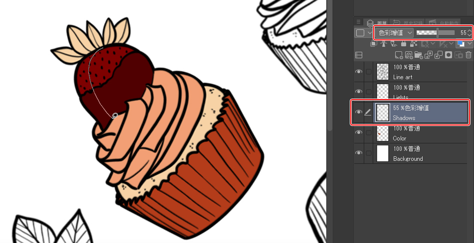 將陰影圖層的混合模式設為色彩增值。如果看起來太暗,就調低圖層的不透明度。