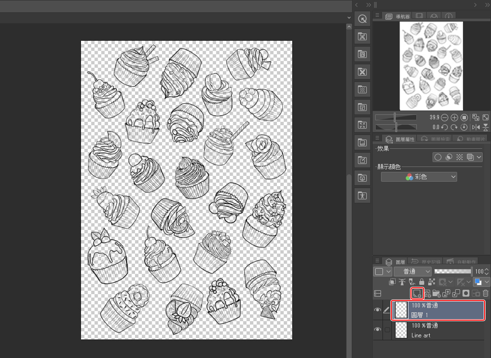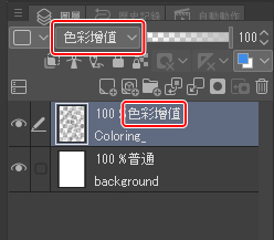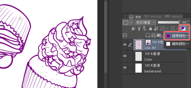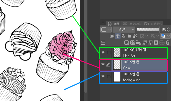 為了使線稿維持顯示的狀態,要讓線稿圖層的位置始終在其他圖層的上面,並將混合模式設為色彩增值。這樣就能確保線稿和下面的圖層都能清晰可見。