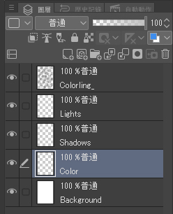 決定好配色後,要在白色背景上建立新圖層。新圖層要用來塗上底色。為了不讓上色過程太複雜,我要在同一個圖層中塗上所有的底色。然後再分別建立陰影用、亮部用的新圖層。那麼就開始著色吧!