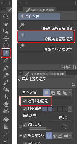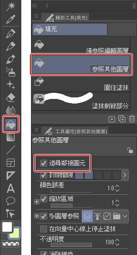 如果要使用[填充]工具,記得開啟[參照其他圖層]的選項,以避免不小心將整張圖層灌色。