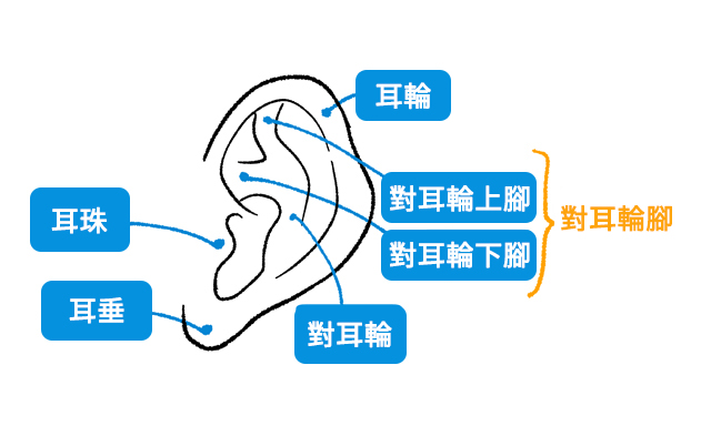 「耳輪」指的是耳朵的外緣。耳輪內側有「對耳輪」,因為是和耳輪成對的部位所以叫做「對耳輪」,這樣想會比較容易記憶。