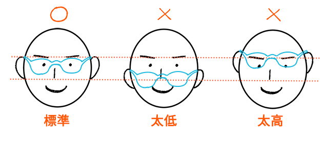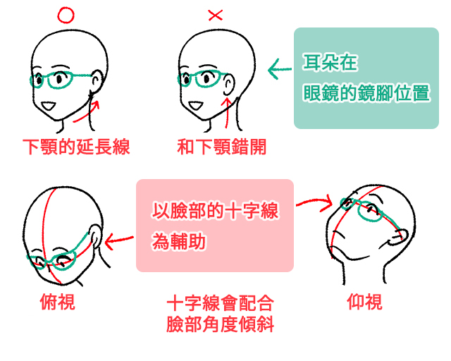 耳朵最上緣和和眉毛相近,最下方和鼻頭相近,決定耳朵的上下位置時能以此為基準,留意支撐眼鏡鏡腳的位置。繪製少女漫畫風的圖時,很多人會把位置畫得太低,這點請注意。